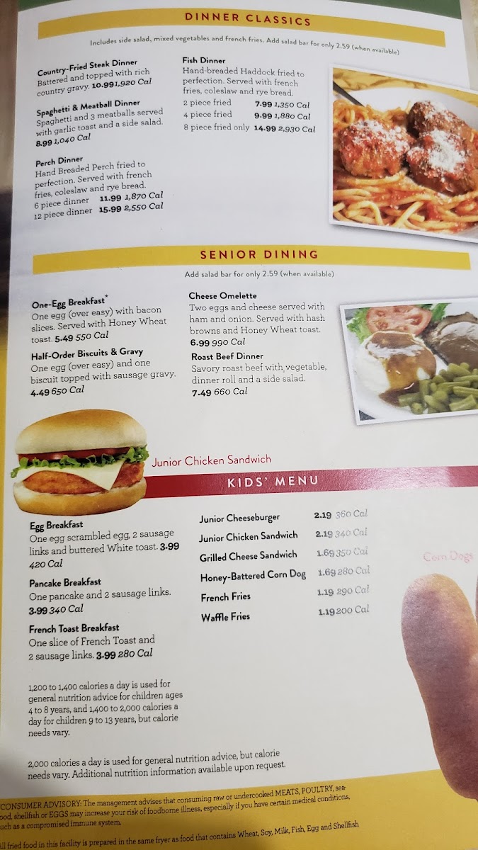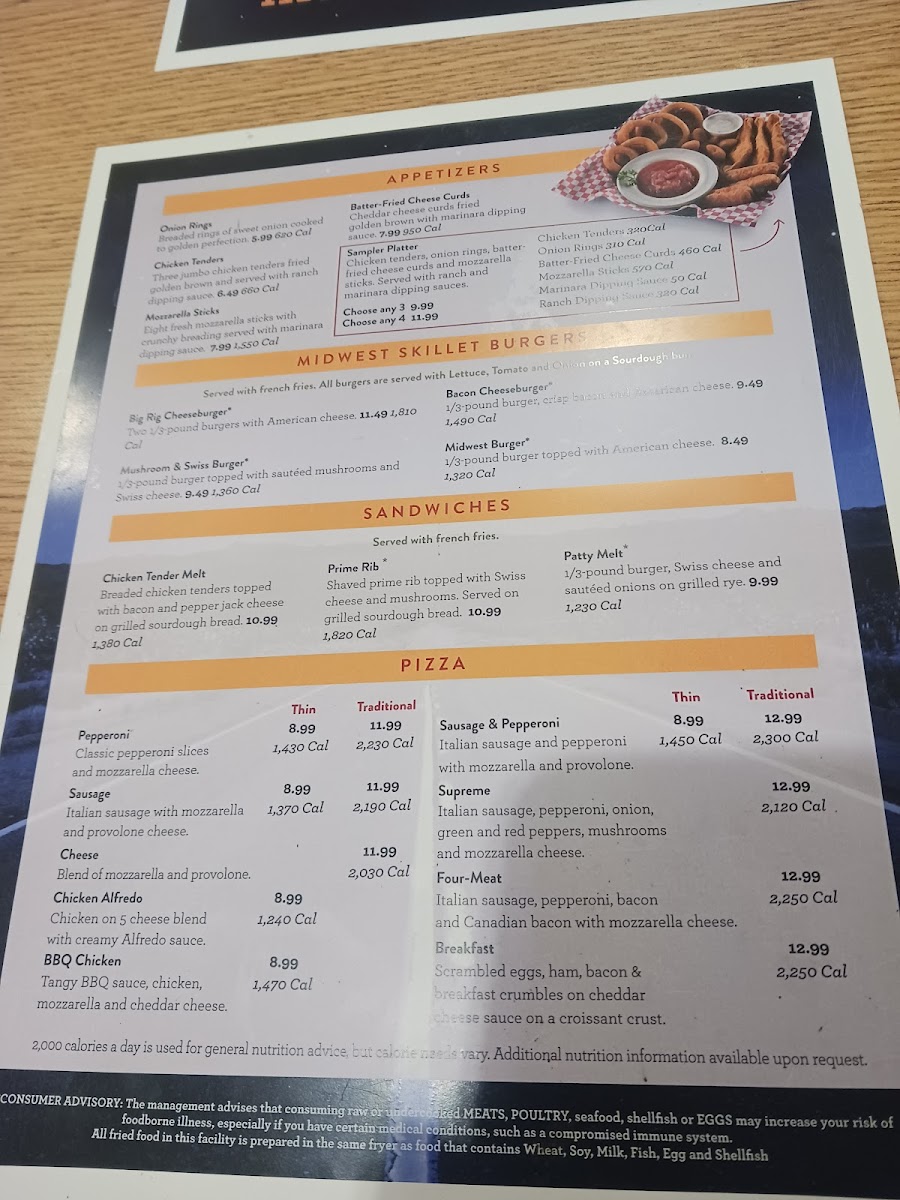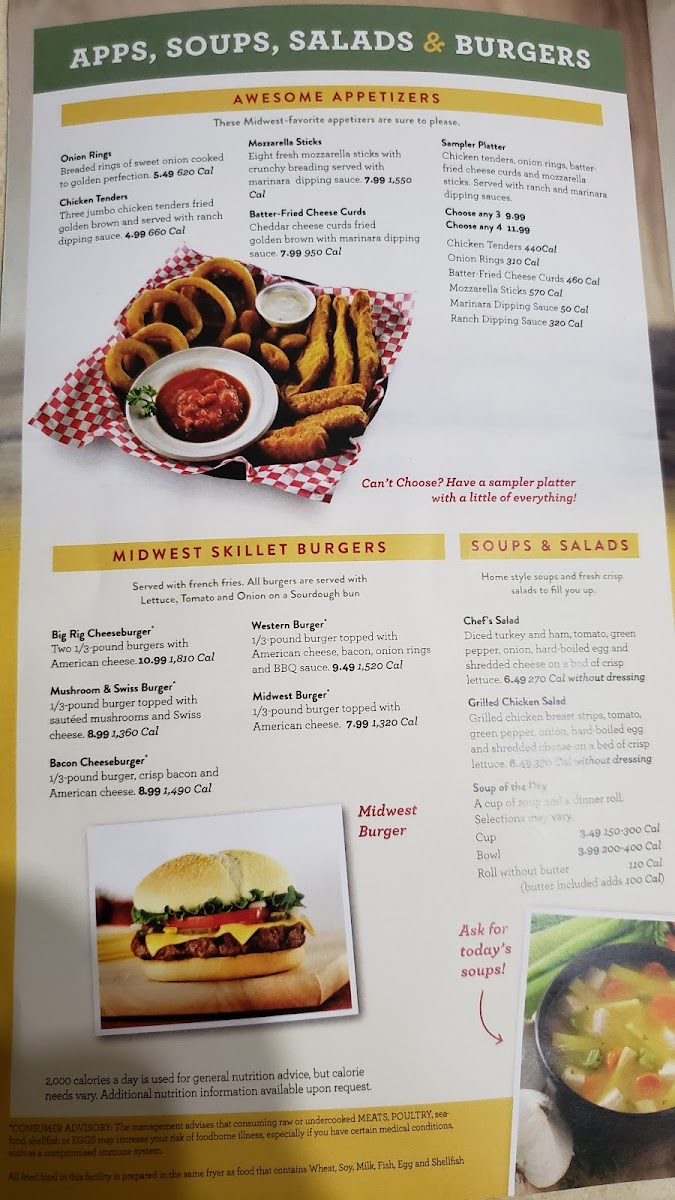 The menu boasts a delightful selection, featuring crispy Fried Chicken starting at just $4.49 and tender Hand-Breaded Chicken Tenders for $5.99. Indulge in the delicious Midwest Skillet Burgers like the satisfying Big Rig Cheeseburger, priced at $10.49, or savor the rich flavors of the Prime Rib Sandwich.